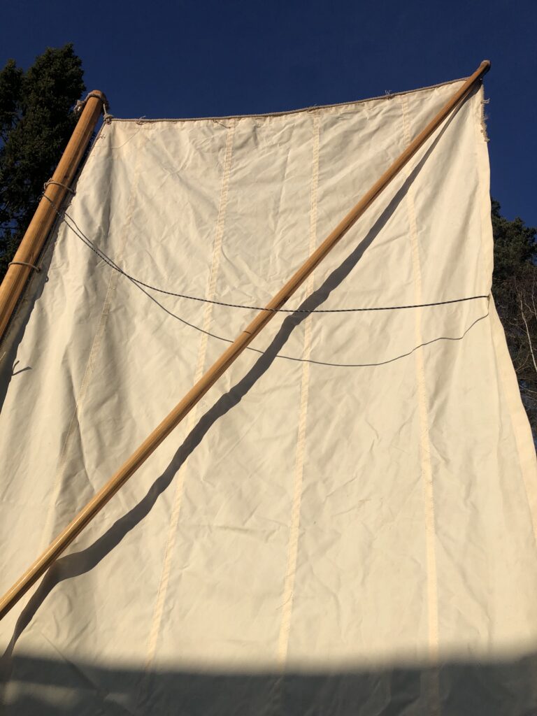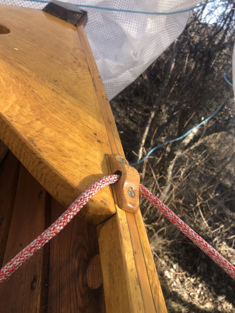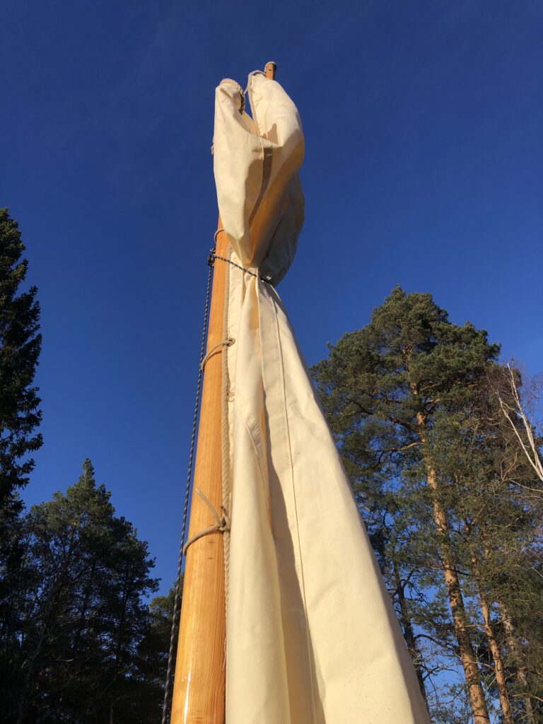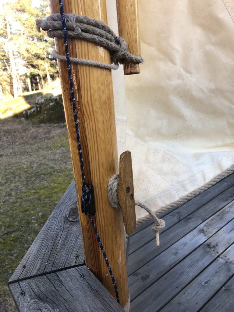 Nu är rundhult till riggen och seglen förberedda med beslag, fall och tampar. Vi tillverkar beslag, bänslar kaus, splitsar ringar, hank och öglor själva.